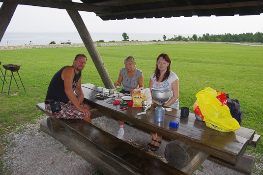 Ir sestdiena, trešā diena, ko pavadām Sāremā salā. Tā ir pēdējā mūsu ceļojuma diena, vakarā sešos mūs gaida jau iepriekš rezervētais prāmis uz kontinentu. Visu nakti apkārt ducināja pērkons, „fotografēja” zibeņi, taču virs mūsu nometnes nenolija neviena lietus lāsīte. Priecīgi par to gribam jau gatavot brokastis, taču pēkšņi nez no kurienes uzradies lietus izjauc mūsu plānus. Steigā novācot teltis un mantas, nolēmām brokastu kafiju izdzert civilizācijā. Pirmais mūsu šīsdienas apskates objekts – Pangas klintis salas ziemeļos.