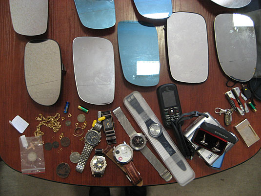 Vēlāk iecirknī, pārbaudot aizturētā vīrieša somas, policisti tajās atrada 49 automašīnu atpakaļskata spogulīšus, vienu auto magnetolu un citas mantas. Sākumā vīrietis mēģināja izvairīties no atbildības, nosaucot sava brāļa personas datus, bet policistus piemānīt neizdevās. Noskaidrots, ka aizdomās turamais dzimis 1982. gadā un agrāk jau četras reizes sodīts par automašīnu apzagšanu, turklāt nonācis policijas redzeslokā arī par narkotiku lietošanu.