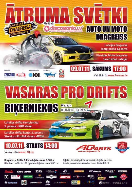 9. jūlijā ar DISCOMANIA.lv atbalstu Biķerniekos notiks „Latvijas Dragreisa Čempionāta 3. posms” un sezonas vienīgais moto dragreiss „Moto Dragrace Cup 2011”, bet 10. jūlijā – „Latvijas PRO Drifta Čempionāta 2. posms” un „AD Part Drifta Kausa 2. posms”. Skatītājiem šī ir vienreizēja iespēja divas dienas baudīt ātrumu, dūmus un krāšņus šovus, turklāt, pērkot biļeti uz dragreisu, driftu iespējams apmeklēt tikai par vienu latu!