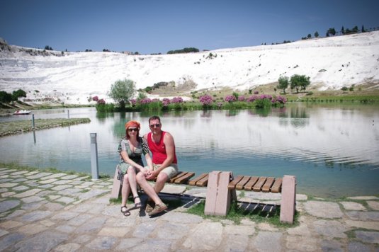 Jau tuvojoties Pamukkale ciematam var redzēt neskaitāmas tūristu grupas, kas kā skudriņas tipina pa baltajām brīnumu terasēm. Arī ciemata iedzīvotāji ir aktīvi iesaistījušies tūrisma biznesā, uzbāzīgi piedāvājot savas preces un pakalpojumus. Ak, Turcija, Turcija - arī šeit Tu esi savādāka: skaļa, uzbāzīga, naudaskāra. Mēs tikai nedaudz pakavējāmies slaveno terašu pakājē, uztaisījām dažas fotogrāfijas un devāmies tālāk. Tomēr tiem, kas atpūšas kādā Turcijas kūrortā un grib redzēt kaut ko vairāk par jūru un pludmali, iesakām atbraukt ekskursijā uz šejieni, lai redzētu gabaliņu no īstās Turcijas.