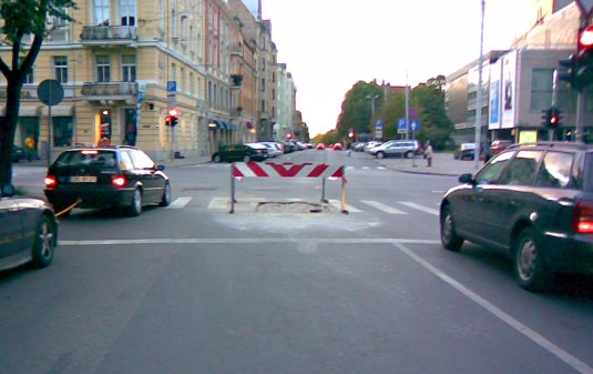 Un tātad - Bruņinieku un Brīvības ielu krustojums. 2009.gada 13.septembris. Aiz stoplīnijas uzstādīts vertikālais ceļa apzīmējums Nr. 912.