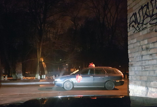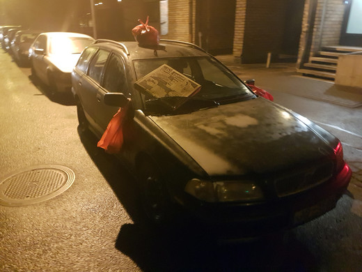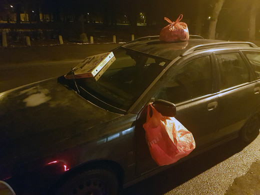 Šonakt Klusā ielā Rīgā pie kādas iebrauktuves pagalmā kāds interesantā veidā bija sodījis autovadītāju, kurš savu auto novietojis stāvēšanai, apgrūtinot iebraukšanu un izbraukšanu. Kā atgādinājums vadītājam, ka viņa automobilis traucē pārējiem, "Volvo" markas spēkrats tika izrotāts ar dažādiem atkritumiem. Šoreiz pašvaldības policijas protokola vietā aiz logu tīrāmās slotiņas aizlikta picas kaste.