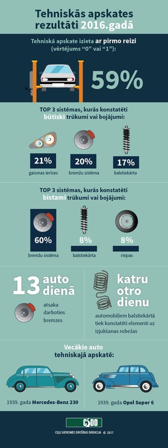 Jaunākie apkopotie dati rāda, ka 2016. gadā tehnisko apskati ar pirmo reizi izgāja 59% automobiļu. Tas nozīmē, ka gandrīz katrs otrais auto nav bijis tehniskajā kārtībā.