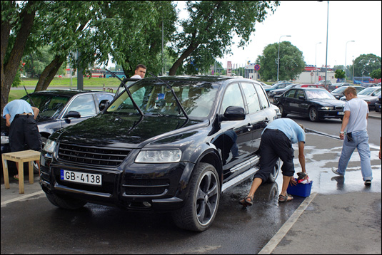 Lai noskaidrotu, kas tad tieši tur notiek un galvenais - kā notiek, ar redakcijas auto devāmies izmēģināt šo operāciju "dzīvajā". Uzreiz jāsaka, ka tie, kas paredzēja tukšu mazgātuvi, var mierīgi iet un iedzert vēsu limonādi - laukumā pie t/c "Mols" mašīnu nomazgāt gribētāju bija vairāk nekā mazgātuves darbinieku. Kā novērojām, stundas laikā (ceturtdien ap plkst 14), visi mazgātāji bija aizņemti. Iedrošināja arī turpat mazgātie pietiekami dārgi automobiļi - ja jau viņi riskē, tad mūsu aparātam neviens neko nenodarīs.