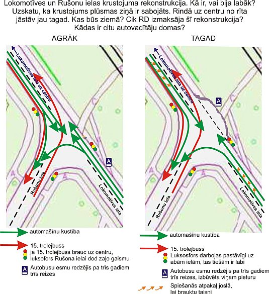 Ir dzirdētas baumas, ka rekonstruējamajā Lokomotīves ielas posmā plāno palaist sabiedriskā transporta joslu no jaunā park&ride uz centru - tapēc arī glaunās autobusa pieturas. Autoram tomēr pilnībā piekrītu - krustojums sačakarēts.