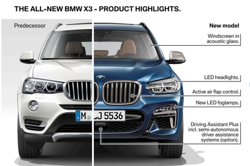 BMW X3 dizainā ir ievietsti daži jaunumi, salīdzinot ar iepriekšējo modeli - radiatora režģis, galveno lukturu bloki, miglas lukturi, izpūtēju forma, bagāžnieka vāks un aizmugurējie lukturi.