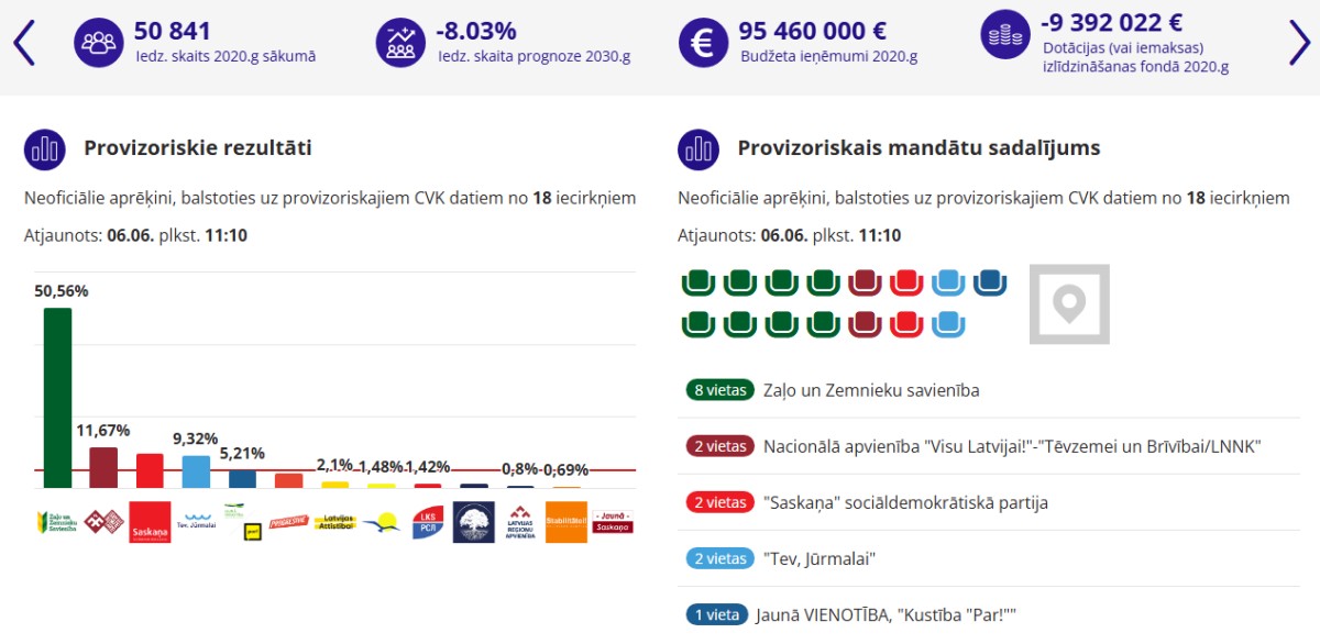 2021.gada Jūrmalas pašvaldības vēlēšanu rezultāti Foto: Ekrānuzņēmums no lsm.lv/velesanas2021/novads/jurmala