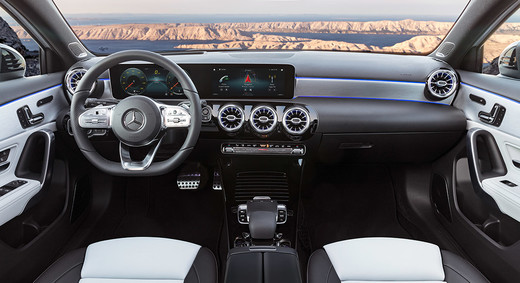 Salonā pogu un slēdžu daudzums samazināts līdz minimumam. Dominē divi lieli 10,25 collu ekrāni ar mērinstrumentu paneļa un multimediju sistēmas funkcijām. Daļu funkciju var pārvaldīt ar balsi, aktivizējot sistēmu ar uzrunu „Hey, Mercedes”. Par piemaksu var pasūtīt projekcijas displeju vai skārienpaliktni vidus tunelī, ja kādam funkciju pārvalde šādā manierē ierastāka un ērtāka.