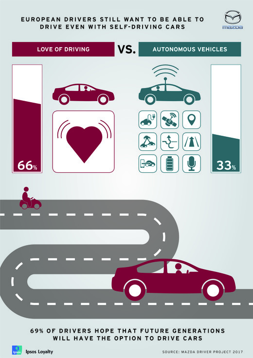 Mazda uzskata, ka autovadīšana ir prasme, ko cilvēki vēlas saglabāt. Tā ir darbība, kas var būt gan aizraujoša, gan funkcionāla, un daudzi vēlētos šo prasmi saglabāt nākamajām paaudzēm. Šis sentiments ir skaidri saredzams pētījuma rezultātos, kas apliecina būtisku emocionālo saikni starp automobili un tā vadītāju. Piemēram, vidēji 69% autovadītāju “cer, ka arī nākamajām paaudzēm būs iespējas vadīt automobiļus”, Polijā šim rādītājam sasniedzot 74%, bet Apvienotajā Karalistē, Vācijā, Francijā un Zviedrijā – 70% vai vairāk.