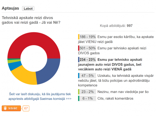 Es tiešām gribētu redzēt leišu statistiku - cik liels procents avāriju viņiem ir dēļ tehniskā stāvokļa, un cik daudz avāriju tas ir. Jo tur tiešām uz ceļiem gadās redzēt visādus nožēlojamus šrotus, bet kaut kā joprojām ir reizi divos gados. Vai tik tomēr tie "zinot mūsu iedzīvotāju attieksmi" teksti nebūs zināms pārspīlējums - jo sevišķi paturot prātā, ko tad īsti tā apskate skatās...