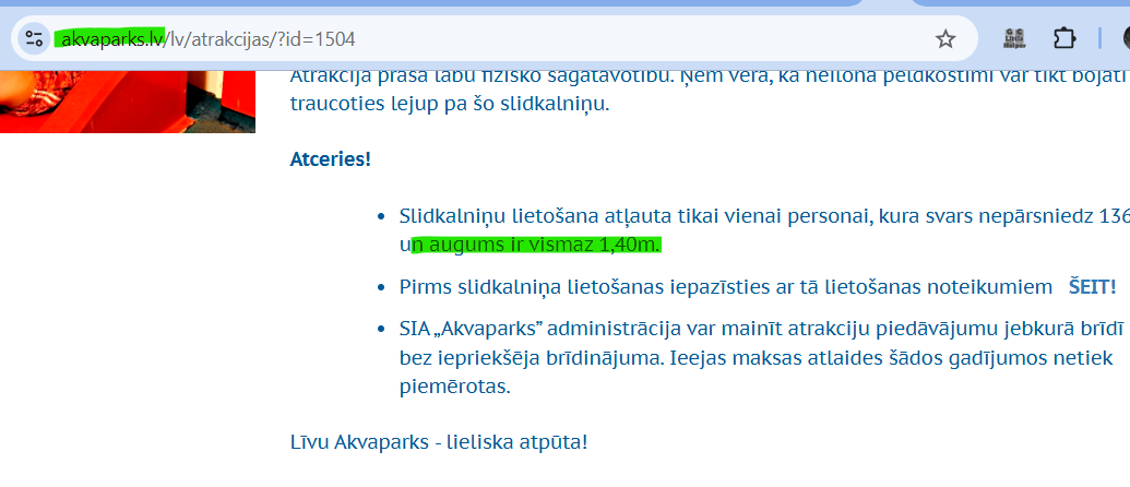 Kādēl tu atkal parādi savu stulbumu? Livu akvaparkā ari nav nekādu auguma ierobežojumu. Ta pat kā Pērnavā. Pernava vispar ta ir parodija nevis akvaparks. Tur nav tadu atrakciju, lai kaut ko aizliegtu.
