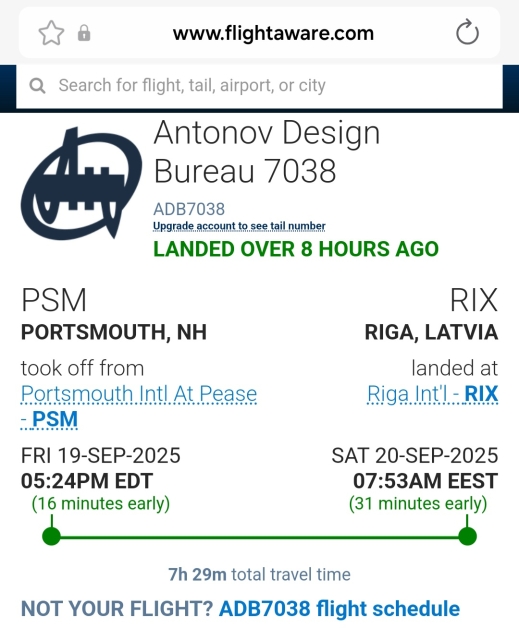 Saskaņā ar FlightAware datiem, šodien, 2025. gada 21. septembrī, ADB7038 ir veicis lidojumu no Rīgas Starptautiskās lidostas (RIX / EVRA) uz Portsmutas Starptautisko lidostu Pease (KPSM) Ņūhempšīrā, ASV.