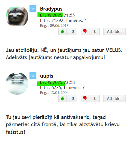 Bet taču rezultāts nepatīk kad “izpaužas” - lūk melis parastais - pēc četrām dienām attapās, ka nav savlaicīgi uzrakstījis kārtējos kretīniskos apmelojumus, jo tik ļoti nepatīk mans viedoklis, kur cenšas šādi “apkarot”. Vai portālam ir jāatbalsta šāda veida (starp citu tā ir tipiska “brūno kreklu” izdomāta metode, ko mūsdienās izmanto antifa un viņu domubiedri) “komunikācija”.