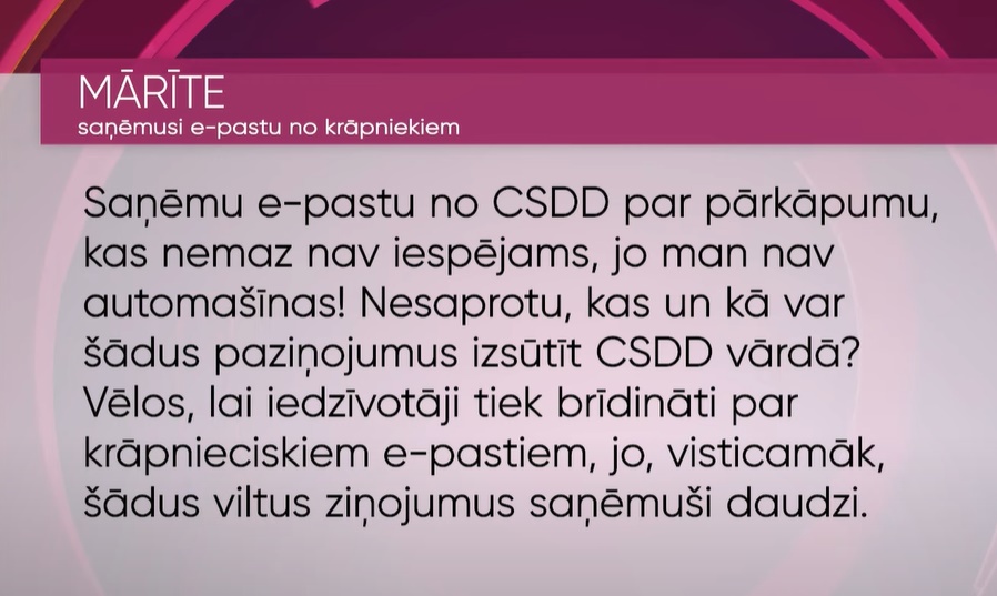 Saņemts paziņojums no CSDD par it kā neapmaksātu sodu. Kam jāpievērš uzmanība, lai neiekristu krāpnieku nagos? Saņemot šādus krāpnieciskus e-pastus, ir svarīgi ziņot kā policijai, tā arī uzņēmumam, kura vārdā tie sūtīti, lai pēc iespējas ātrāk varētu rīkoties un informēt citus. Lasīt vairāk
