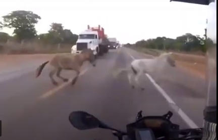 Motociklists piedzīvo sadursmi ar kumeliņu, kas negaidot izskrien uz šosejas no aizsega, ko veido divi kravas auto. Lasīt vairāk