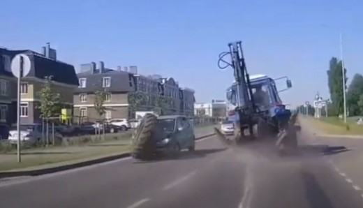 Traktors pazaudē riepu, kas atsitoties pret pretimbraucošo automobili paspēj "ieriebt" arī video filmētājam. Lasīt vairāk