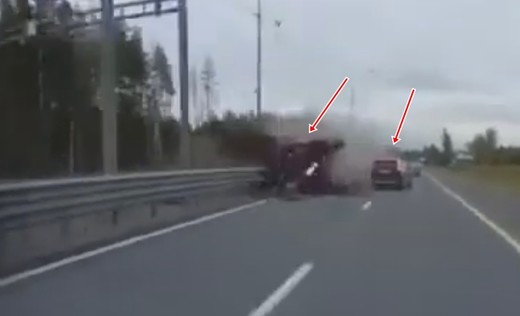 Abi pa kreiso autostrādes joslu braucošie transportlīdzekļi izglābjas brīdī, kad avarējošs kravinieks iztriecas cauri barjerām. Lasīt vairāk