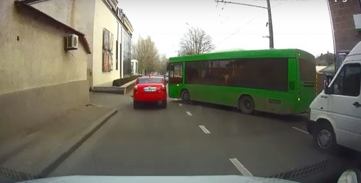 Neraugoties uz to, ka vieglais auto bremzē, bet autobusa vadītājs pārliecinās (iespējams) par drošību izbraucot no pieturvietas, abu transportlīdzekļu sadursme tomēr notiek (no 0:15). Lasīt vairāk