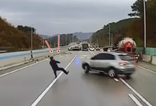 Kāds cilvēks, kas, visticamāk, izkāpis no savas avarējušās mašīnas, dažās sekundēs izvairās vismaz no četriem citiem spēkratiem, kas kļuvuši nevadāmi "melnā ledus" dēļ. Lasīt vairāk