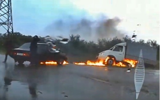 Kravas furgons izbrauc priekšā vieglajam auto un sadursmes rezultātā notiek aizdegšanās. Lasīt vairāk