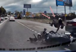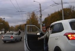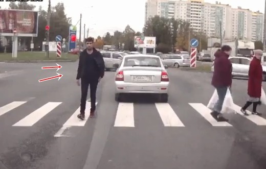Baltā automobiļa vadītājs ne tikai ignorē noteikumus, pārbraucot gājēju pārejai pie sarkanās gaismas, bet arī agresīvi uzvedas, nākot pie video autora izskaidroties. Pēdējais daudz nedomā un "nomierina" agresīvo vadītāju ar piparu gāzes baloniņu. Lasīt vairāk