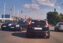 Motociklists saduras ar automobili un paliek uz tā jumta.Video beigas pazūd aiz kadra, taču, šķiet, ka sadursme ir veselībai bez sekām un apmetot salto, motociklists paliek uz mašīnas jumta stāvus. Lasīt vairāk