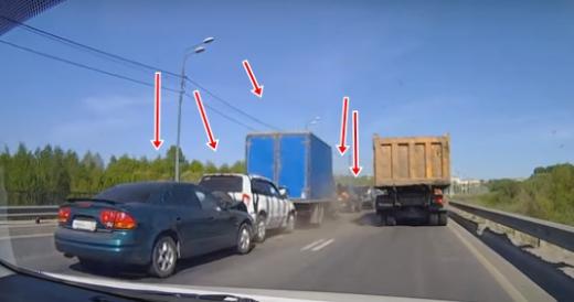 Avārija, kurā saduras pieci, viens aiz otra braucoši spēkrati (skatīt no 0:30). Lasīt vairāk