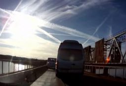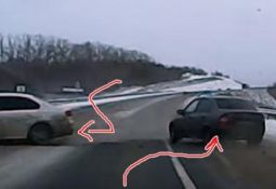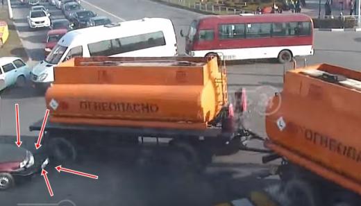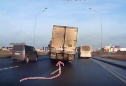 Kravas auto, griežoties pa labi, noplēš buferi vieglajam auto, kas, iespējams, iebraucis par dziļu krustojumā. Lasīt vairāk