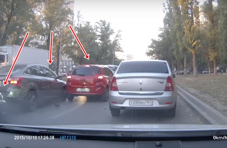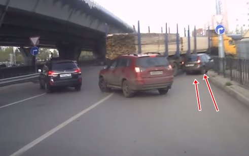 Kravas auto ar garu "asti" piespiež vieglo automašīnu, kas iebrauc brīvajā spraugā. Lasīt vairāk