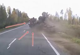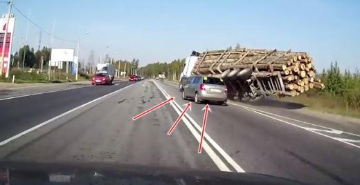 Video iesūtītājs skaidro, ka izbraucot priekšā baļķvedējam, nepieredzējušais autovadītājs ar vieglo "Škoda" izraisa situāciju, kuras rezultātā uz sāniem apgāžas divi kravas auto (skatīt no 0:30). Lasīt vairāk