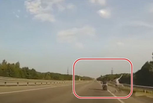Motociklists aizķer velosipēdistu, kurš krītot gandrīz pakļūst zem automašīnas riteņiem. Lasīt vairāk
