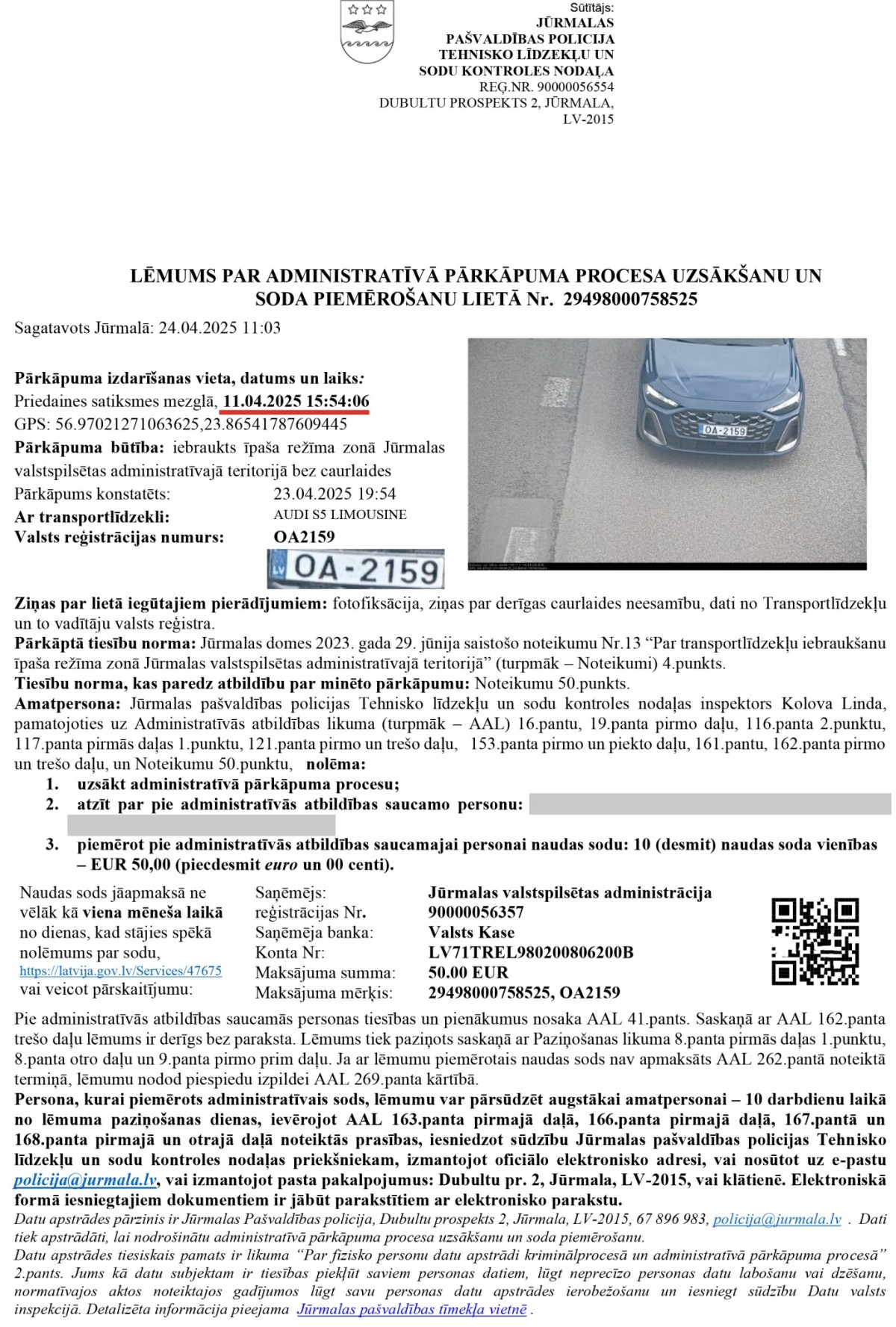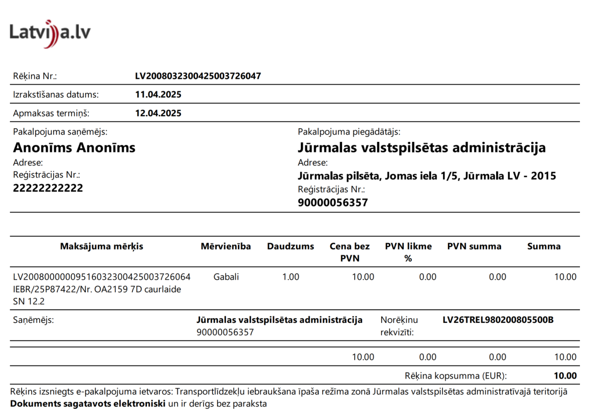 Aplūkosim piemēru no situācijas pavasarī, kad ir piefiksēts tas, ka “Audi” automobiļa vadītājs ir iebraucis īpaša režīma zonā Jūrmalas valstspilsētas administratīvajā teritorijā bez caurlaides. Pati iebraukšana bez caurlaides gan vēl nav pārkāpums, jo noteikumos ir minēts, ka to var iegādāties līdz nākamās dienas plkst. 23.59. Šajā gadījumā iebraukšana notika 11. aprīlī, līdz ar to caurlaidi drīkstēja iegādāties līdz 12. aprīļa beigām. “Audi” vadītājs šajā termiņā to arī izdarīja, par 10 EUR nopērkot caurlaidi septiņām dienām. Bet par ko tad sods?