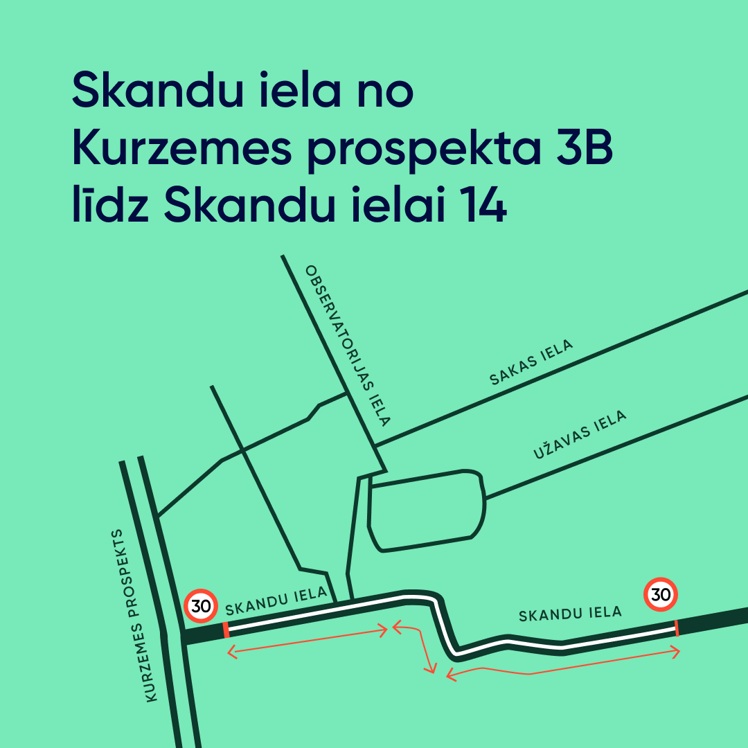 Ierobežojums 30 km/h tiks ieviests arī Imantā - Skandu ielas posmā no Kurzemes prospekta 3B (vietā, kur beidzas ietve) līdz Skandu ielai 14 .