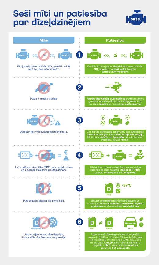 Patiesība: Gan naftas pārstrādes uzņēmumi, gan autoražotāji mūsdienās ir spēcīgi inovatori. Šodien jaunie dīzeļdzinēji ir progresīva tehnoloģija, kas garantē jaudīgu, drošu un efektīvu, kā arī videi draudzīgāku pārvietošanos ikdienā. Papildus tam, kombinējot jauno dīzeļdzinēju automašīnas ar atjaunojamo degvielu, videi tiek radīts vēl mazāks kaitējums. Visi šie sasniegumi ir iespējami, pateicoties spēcīgam zinātnes darbam, testiem un investīcijām dīzeļa attīstībā.