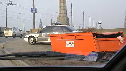 Pirmā doma - nevar būt! Auto (Rover, valsts numurs CF4035) stāv uz tilta, piedevām uz ietves! Turklāt bez ieslēgtām bākugunīm! Šķiet, ar jauna ministra parādīšanos, drīz ceļu policistu transports stāvēs visur, kur vien vēlēsies. (Svētdien jau redzēti CP automobiļi stāvam uz Salu tilta.)