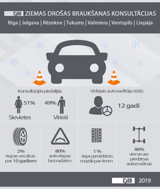 Ceļu satiksmes drošības direkcijas (CSDD) organizētajās drošas ziemas braukšanas konsultācijās Rīgā, Jelgavā, Tukumā, Rēzeknē, Valmierā, Liepājā un Ventspilī šogad piedalījies rekordskaits cilvēku – vairāk nekā 700 autovadītāju.