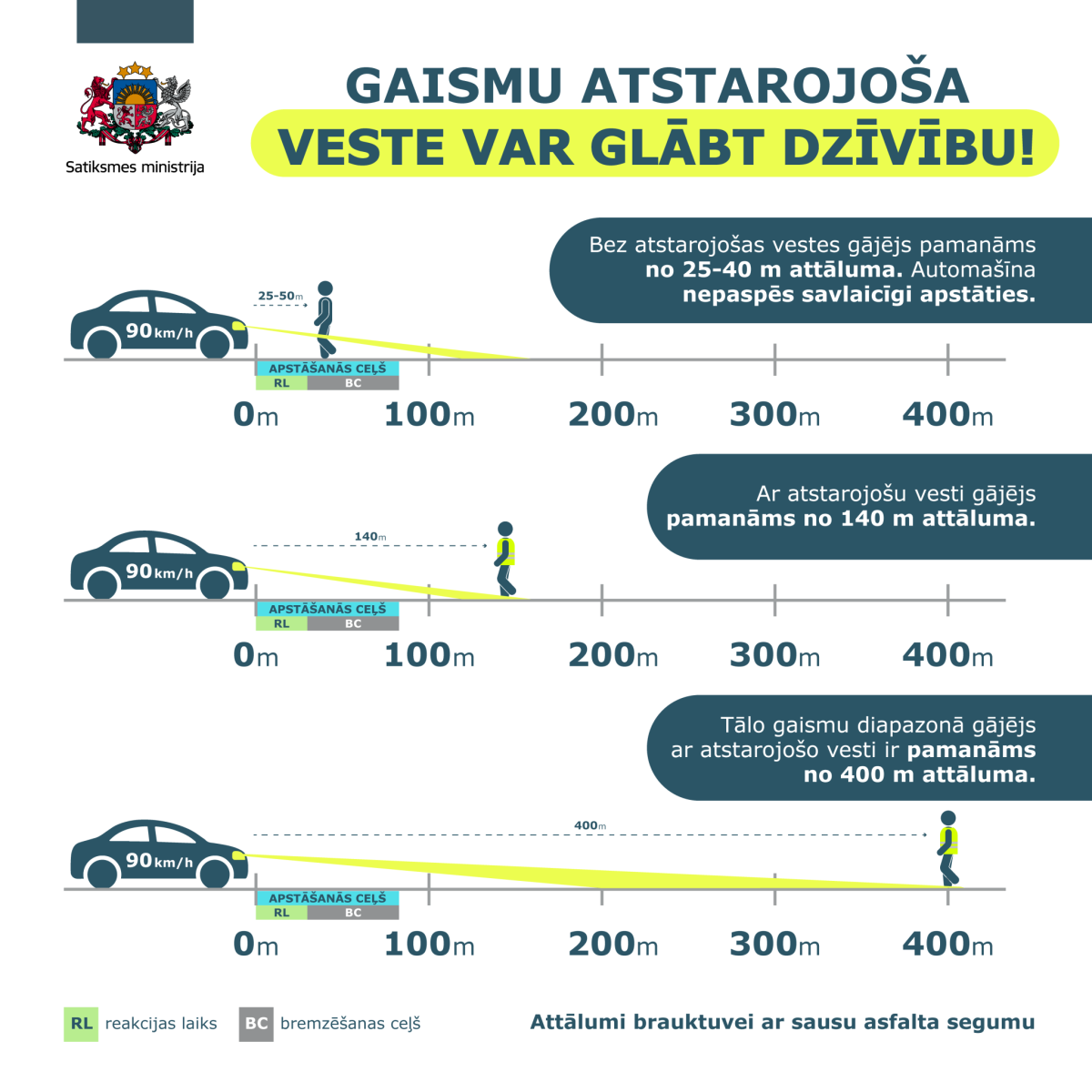 “Ar atstarojošu vesti cilvēks ir pamanāms, un autobraucējs var savlaicīgi nobremzēt, izvairoties no sadursmes. Uz ceļa ar asfalta segumu ārpus apdzīvotām vietām, kur var braukt ar 90 km/h, cilvēku ar gaismu atstarojošo vesti tuvo gaismu diapazonā var pamanīt 140 metru attālumā. Savukārt, ja cilvēks uz brauktuves ir bez atstarojoša elementa, to var pamanīt aptuveni 25-40 metru attālumā, kas nav pietiekami, lai apturētu transportlīdzekli, jo bremzēšanas ceļš ir aptuveni 100 metrus garš. Tāpat jāņem vērā, ka lietainā laikā redzamība ir sliktāka, un bremzēšanas ceļš garāks,” uzsver nozares eksperts.