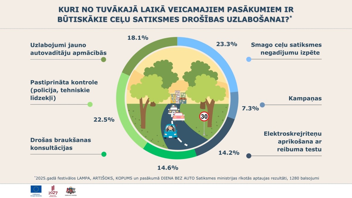 2025. gadā Satiksmes ministrija (SM) festivālos LAMPA, ARTIŠOKS, KOPUMS, kā arī Eiropas Mobilitātes nedēļas pasākumā “Diena bez auto” aicināja apmeklētājus piedalīties aptaujā un paust viedokli par tuvākajā laikā veicamajiem pasākumiem ceļu satiksmes drošības uzlabošanai. Lasīt vairāk