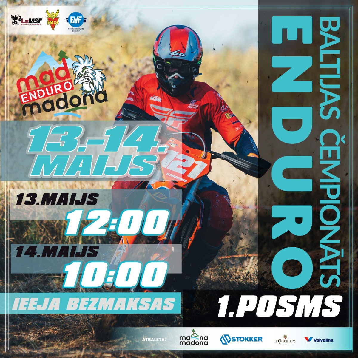 Maija otrajā nedēļas nogalē – 13. un 14. datumā Madonā, motoparkā “Smeceres sils” startēs Baltijas čempionāta un kausa pirmais posms, Latvijas čempionāta un kausa otrais posms enduro “Madona 2023”, kā arī tas būs Igaunijas čempionāta un kausa trešais posms, Lietuvas čempionāta un kausa otrais posms enduro.