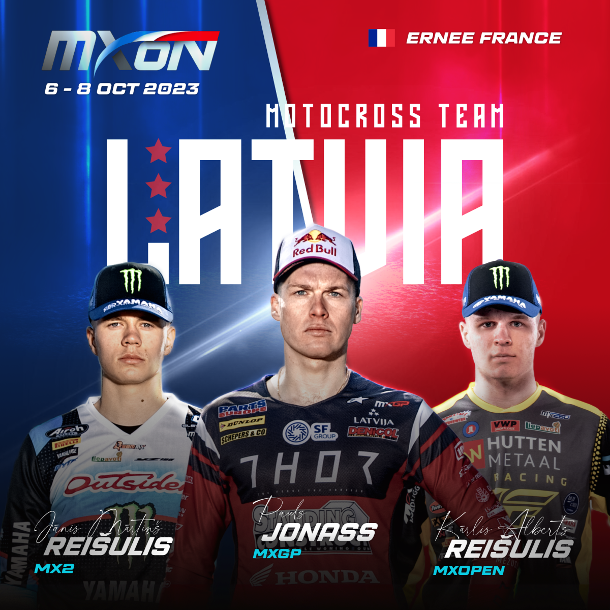 Kā apstiprināja LaMSF Motokrosa komisijas vadītājs Kristers Serģis, šā gada Eiropas čempionāta līderis 125cc klasē Jānis Mārtiņš Reišulis Nācijās startēs MX2 klasē, viņa brālis, pērnā gada Eiropas vicečempions Kārlis Alberts Reišulis pārstāvēs MX Open klasi, bet MX1 ieskaitē uz starta līnijas stāsies titulētais Pauls Jonass. Kā rezervists komandā iekļauts Edvards Bidzāns.