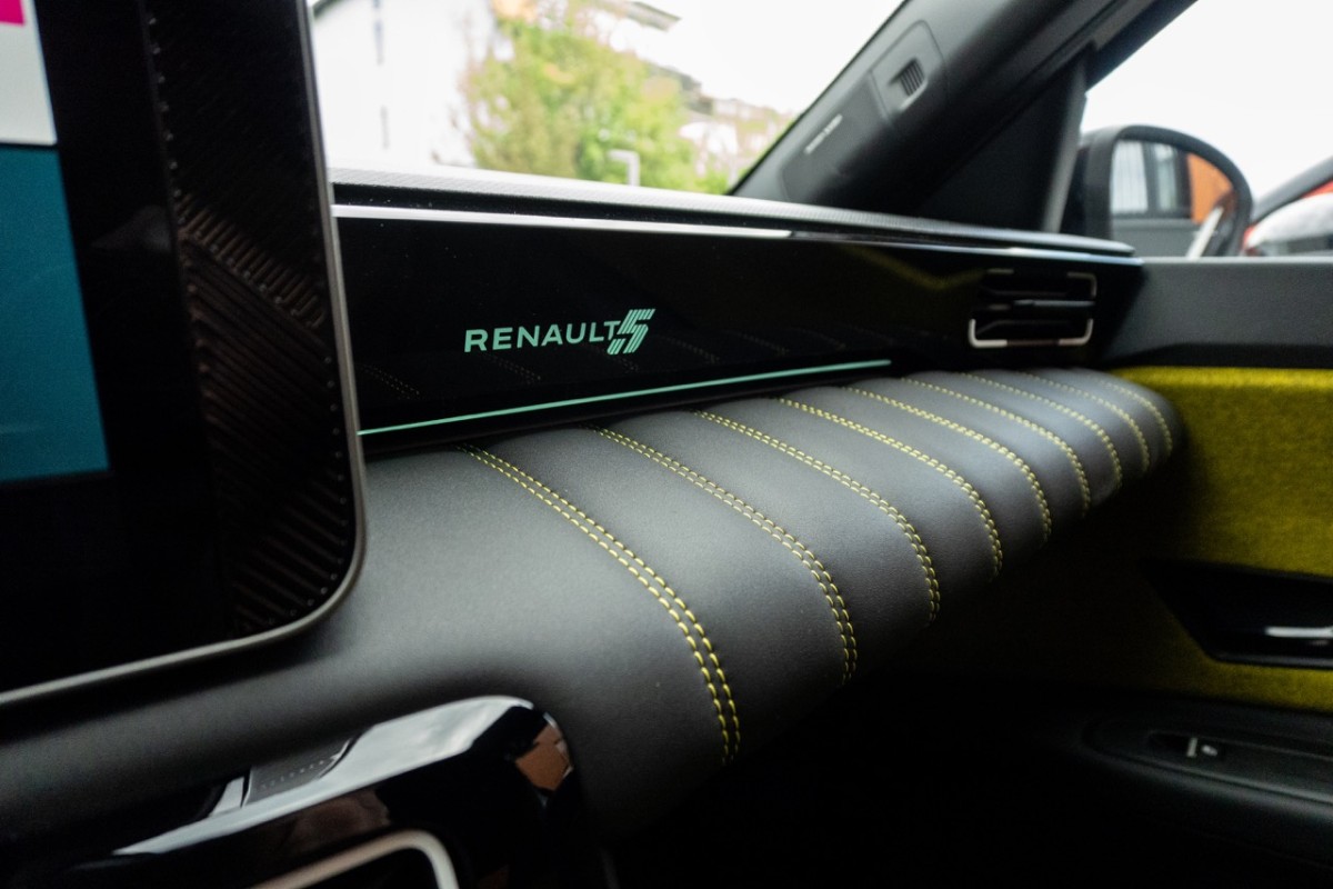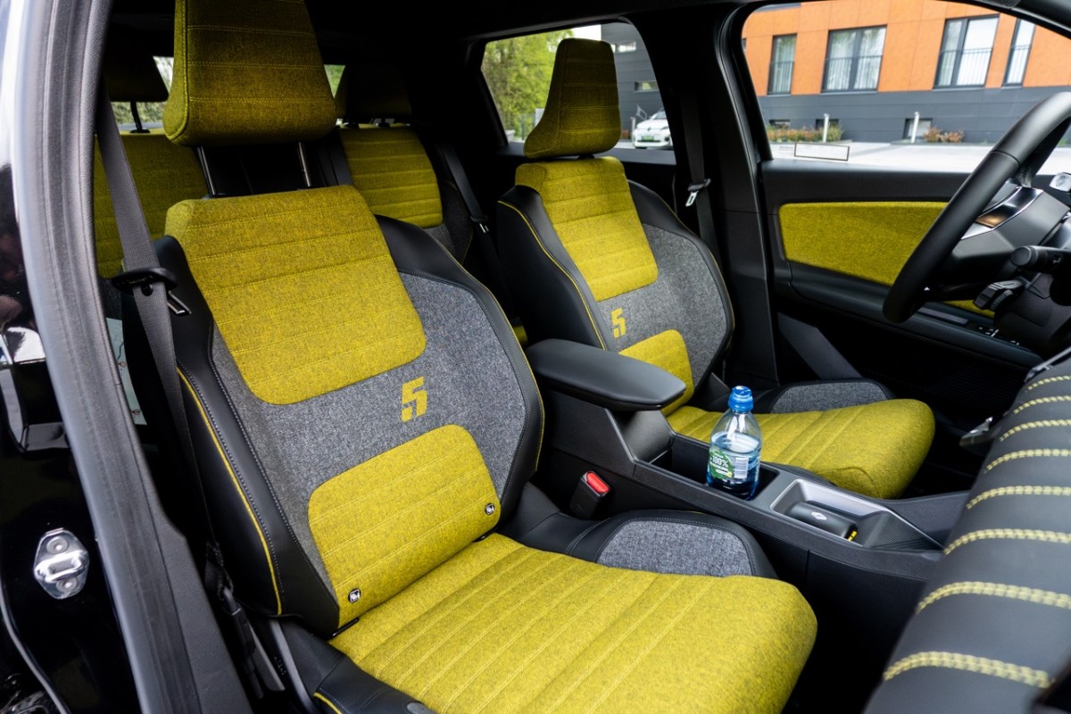 “Renault 5” sēdekļi ir apvilkti ar 100% pārstrādātu materiālu. Lētākajā apdares versijā būs vienkāršs tekstila polsterējums, bet citās džinsa auduma, dzeltena tekstila vai pelēka - īpašajā “Roland Garros” sērijā, kas veltīta "French Open" tenisa turnīram. Apdares materiālu kvalitāte variē no mīkstiem, taustei patīkamiem materiāliem, līdz cietai plastmasai - tajā gan ir iestrādātas dažādas tekstūras, kas vizuāli rada augstvērtīgāku iespaidu. Bet kopumā “Renault 5” salons ir patīkama vieta, kur atrasties. Ja nu vienīgi garāka auguma autovadītāji varētu vēlētos nedaudz garākus sēdekļus ar lielāku atbalstu kājām. Priekšā sēdošajiem ir pietiekami daudz vietas, savukārt aizmugurē vieta kājām ir ierobežota – kompromiss, ko prasa kompakts pilsētas auto. “Renault” šajā modelī piedāvā pielāgot arī dažādas nianses salonā, piemēram, ar maināmu pārnesumu sviras uzgali, vai dažāda dizaina sīklietu kastītēm. Jāuzteic skaņas izolācija salonā. Pat 140 km/h lielā ātrumā salonā ir priekšzīmīgs klusums - vēja un rites trokšņi tiek veiksmīgi apslāpēti.