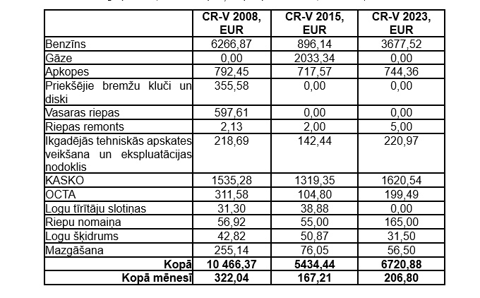 Līdzīgi kā iepriekšējā rakstā, lai labāk varētu salīdzināt ekspluatācijas izmaksas visiem trīs CR-V auto līdzīgā periodā, tabulā ir aprēķins par periodu - 32,5 mēneši: