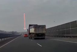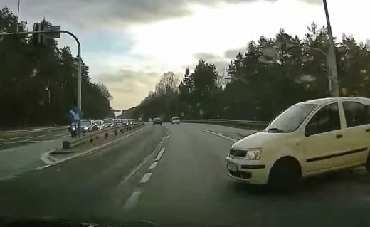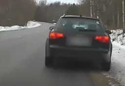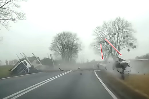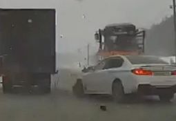 Ford Mondeo, kas tikai pirms dažām sekundēm apdzen filmētāju, ieslīd pretējā joslā un tiek sarauts gabalos atsitoties pret autovedēju. Lasīt vairāk
