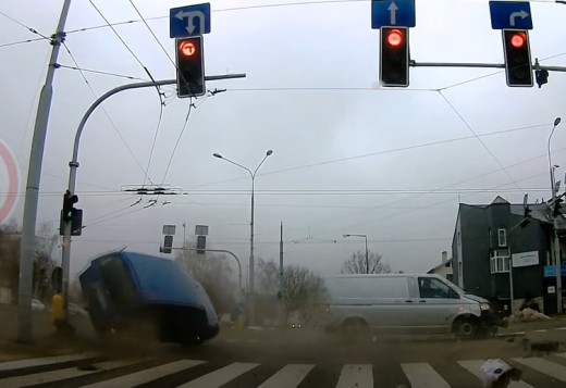 Komentāros teikts, ka zilās automašīnas vadītājs iebrauca krustojumā pie aizliedzošā signāla. Lasīt vairāk