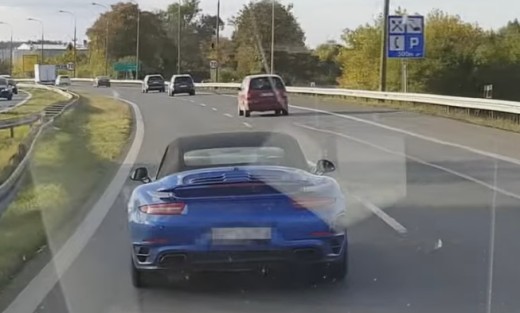 Porsche vadītājs nobremzē satiksmes autobusu kreisajā joslā. No video komentāra var noprast, ka kungu pie Porsche stūres aizkaitināja autobusa manevri, ko tas nevarēja veikt ātrāk ņemot vērā šim transportlīdzeklim paredzēto maksimālo ātrumu 100 km/h. Lasīt vairāk