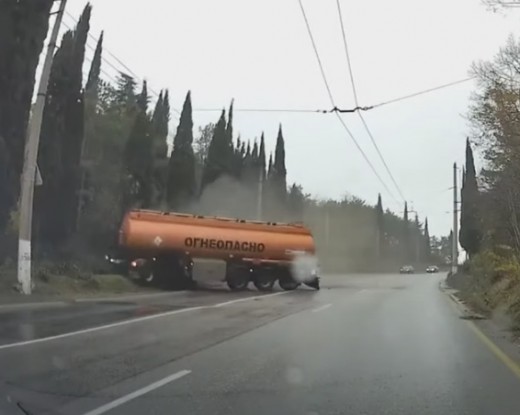 Degvielas vedēja šoferis neizvēlas pareizo braukšanas ātrumu un zaudē kontroli pār savu spēkratu. Šoreiz viss beidzas laimīgi, jo pārējie satiksmes dalībnieki ir drošā attālumā, bet cisterna apstājas dažus metrus no staba. Lasīt vairāk