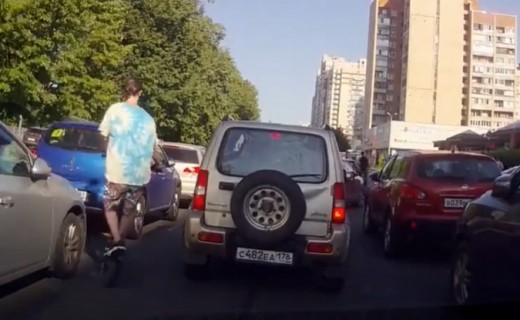 Elektroskrejriteņa vadītājs ir iecerējis izbraukt sastrēgumā stāvošajiem automobiļiem pa vidu, slaidi līkumojot un pūšot taurīti, taču puisi pieviļ tehnika. Lasīt vairāk