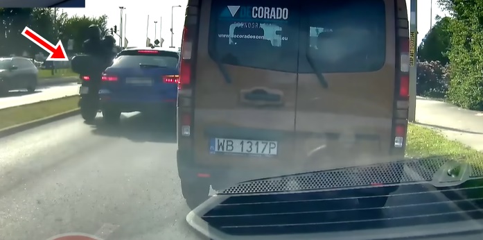 Audi vadītājs pirms labā pagrieziena bloķē motociklu, taču motociklists to apbrauc pa zālienu. Video beigās redzams, ta tas stipri sadusmo autovadītāju, kurš metas pakaļ divriteņu transportam, ignorējot aizliedzošo signālu. Lasīt vairāk