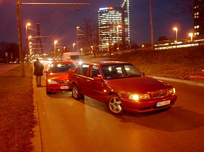Arī es nobremzēju un apturu automašīnu, bet burtiski pēc dažām sekundēm izdzirdu jocīgu skaņu, seko trieciens pa mana auto aizmugures daļu un dzirdams stikla plīšanas troksnis. Skaidrs, kāds nav apturējis automašīnu pie gājēju pārejas. Izkāpju arā, izkāpj arī Ford autovadītājs un skatamies, ka man bojāts ir tikai pakaļējais atdures stienis (bampers), bet stipri vairāk nepaveicies ir Fordiņam, kam izsista lampa, salocīts motora pārsegs, dekoratīvā reste, priekšējais atdures stienis un nedaudz arī kreisais spārns.