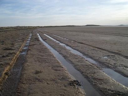 Saprotu, ka apstāties nevar, un saprotu, ka nāk virsū paisums! Uff... Pēc pāris kilometriem izskatās, ka pludmale paceļas pārdesmit centimetrus augstāk, un apstājamies. Agita aiziet skatīties, kāds ceļš iespējams nost no pludmales. Bet problēma tāda, ka mums neviens neseko! Acīmredzot pasāts un subaru vispār nav spējuši izkustēties no vietas! Nekas cits neatliek, kā mēģināt griezties apkārt. Tas izrādās maksimāli grūti – volga norokas pilnīgi līdz tiltam! Ceļu augšā ar domkratu, liekam apakšā laipas, un tā kādas reizes piecas, kamēr izdodas apgriezties pretējā virzienā. Esam abi nojaukušies ar dubļiem līdz acīm, pie kam šie dubļi ir nejauki sāļi.